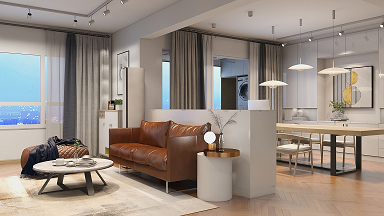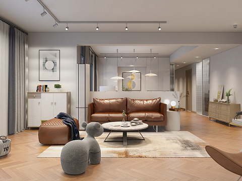 客廳中,設計師選用暖色作為空間的主色調,再搭配白色與原木元素作為空間的點綴,打造簡約的質感。造型簡潔的燈具,線條感十足,為客廳增添明亮的視覺感受。深咖色的沙發使得空間更加沉穩,提升了空間的質感。