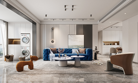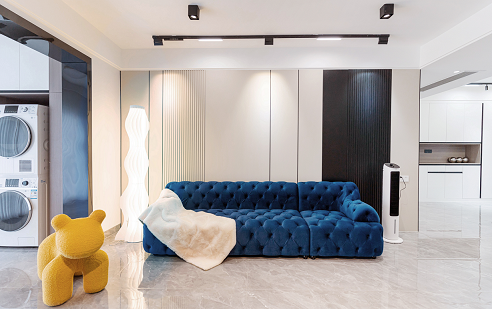 使用更親近自然的棉、麻、木搭配黑、棕、白、灰色,在裝飾上極度的克制,給人高品質,舒服的感受。削弱復雜造型和色彩對人情緒的影響,反而產生了治愈的力量。克萊因藍沙發的點睛之筆,顯得整個空間更加自信,給人傳遞高級的視覺感受。