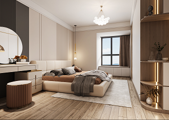 竹炭飾面護墻板做背景,是大空間設計元素在小空間的延續。主臥沒有做過多的造型,大量留白,通過軟裝設計師的巧手來營造氛圍,利用不同色系與材質對比組合形成精致豐盈的裝飾效果,風吹簾動,琉光行云,主臥釋放著樂且晏如的溫柔情緒