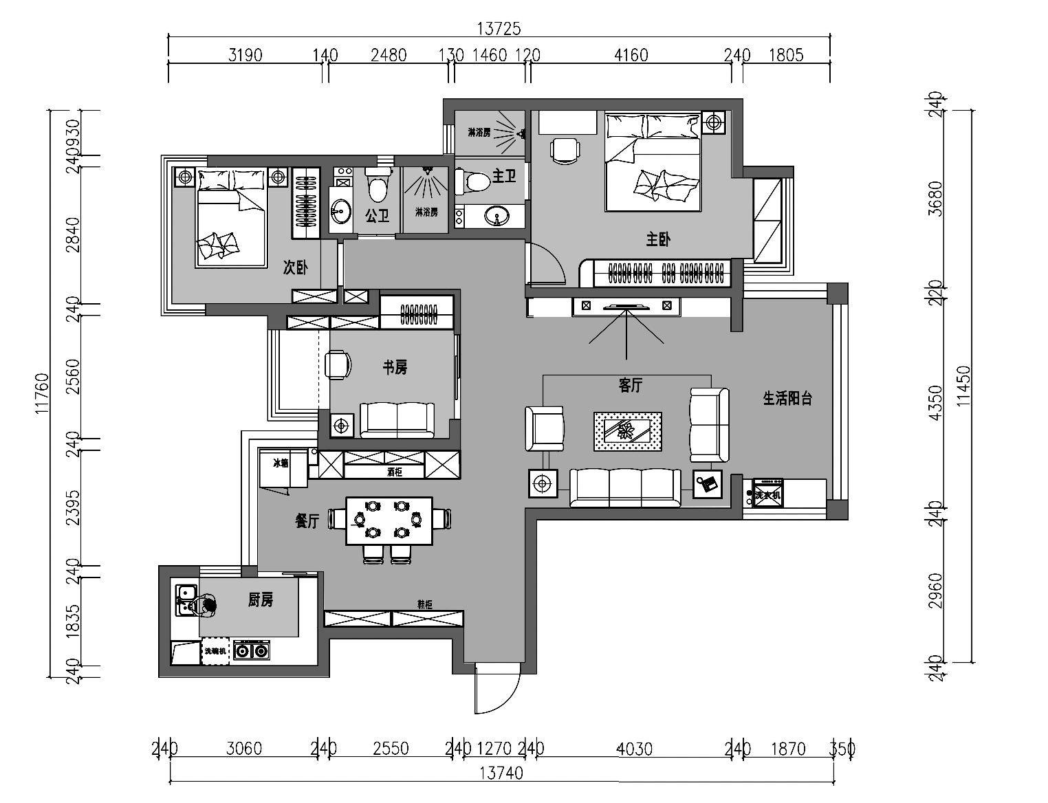 1、改變書房的開啟方向,面朝客廳,實現客廳及書房的南北通透。補充客廳的采光,實現活動及私人空間的分區更加明朗。